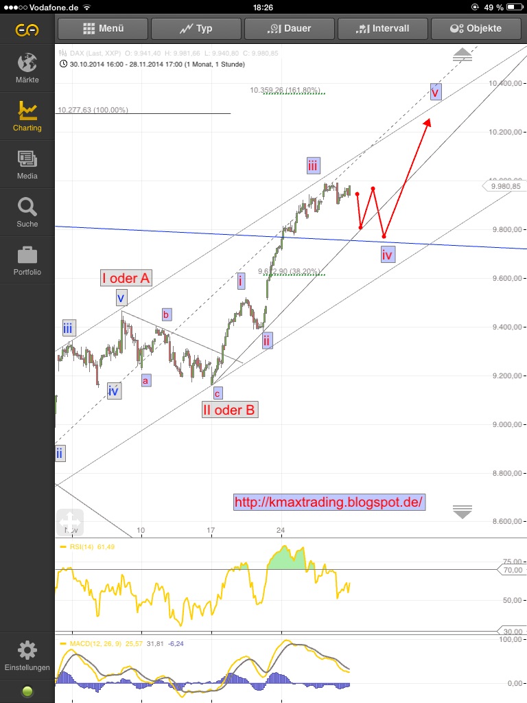 Ob der Anstieg zur 9985 ein Zigzag (mit üb in der b – aus zeitlicher Sicht grenzwertig) und damit die w einer blauen v (bzw. iii) oder ein Flat und damit eine x2 sind wird sich am Montag zeigen.